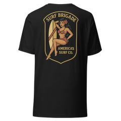 The Surf Brigade Pin-Up Tee blends vintage military-style insignia with old-school surf art, honoring an era when surfboards were simple, style was earned, and community meant everything. The bold crest design frames a retro pin-up surfer—confident, strong, and unapologetically independent—symbolizing the spirit that Surf Brigade was built on.